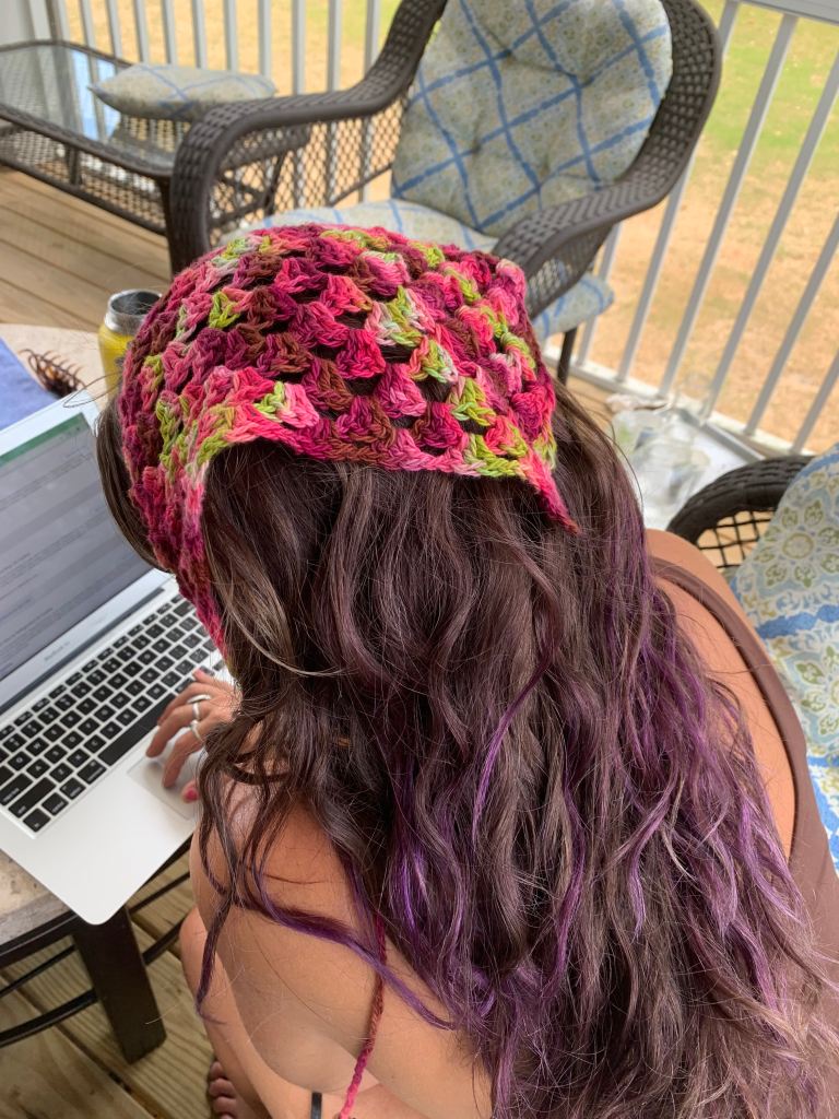 Ties: With a new piece of yarn, create a 22” chain. Once your chain reaches 22”, sc across the long edge of your bandana. Once you reach the end, create the other tie by chaining until it reaches 22” again. Tie off.